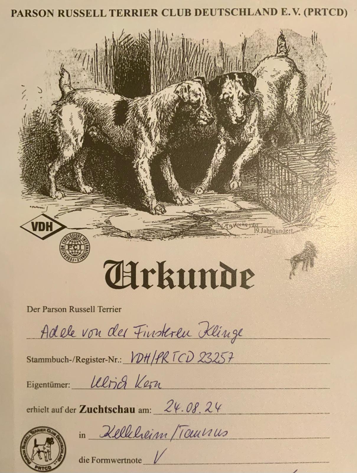 Am 24.08. nahm unsere Parson-Russel-Terrier Hündin Adele von der Finsteren Klinge erfolgreich an der Ausstellung in Kelkheim teil. Besonders stolz sind wir auf ihre herausragende Bewertung – Adele wurde mit der Bestnote „Vorzüglich“ (V) ausgezeichnet! Dieser Erfolg zeigt einmal mehr, wie besonders sie ist, und wir freuen uns riesig über dieses fantastische Ergebnis.