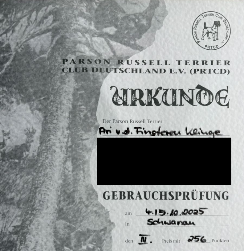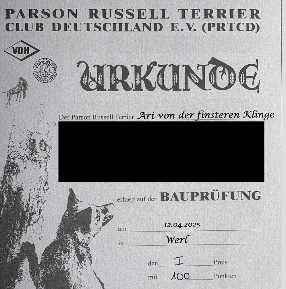 Er bestand sowohl den Wesenstest als auch die Begleithundeprüfung und wird aktuell im Agility geführt.